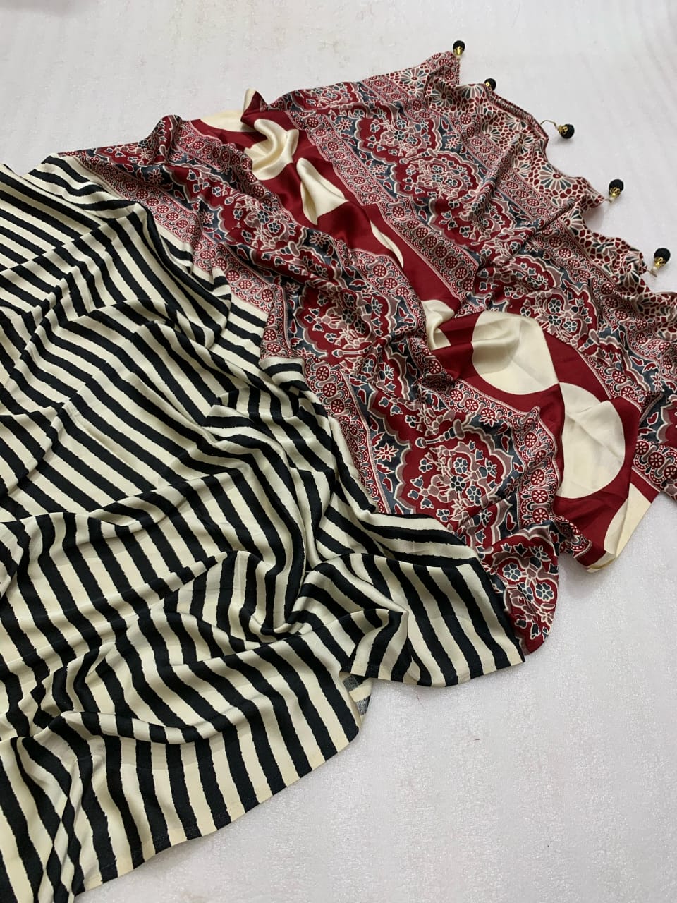 Elevate your wardrobe with the Akruti Modal Silk Ajrakh Natural Printed Saree. Crafted from luxurious red modal silk, this saree features exquisite Ajrakh natural prints that blend traditional artistry with contemporary style. Its lightweight fabric ensures effortless draping, allowing you to achieve a polished look quickly and comfortably. Perfect for those who appreciate expert craftsmanship and modern elegance in one graceful ensemble.