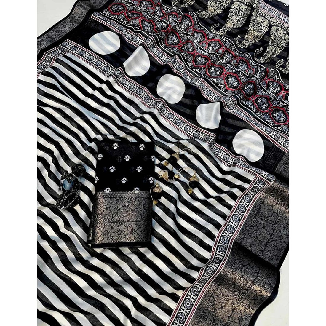 ELEGANT BLACK AND WHITE AJRAKH PALLU WITH BEAUTIFULL WEVING BORDER SAREE