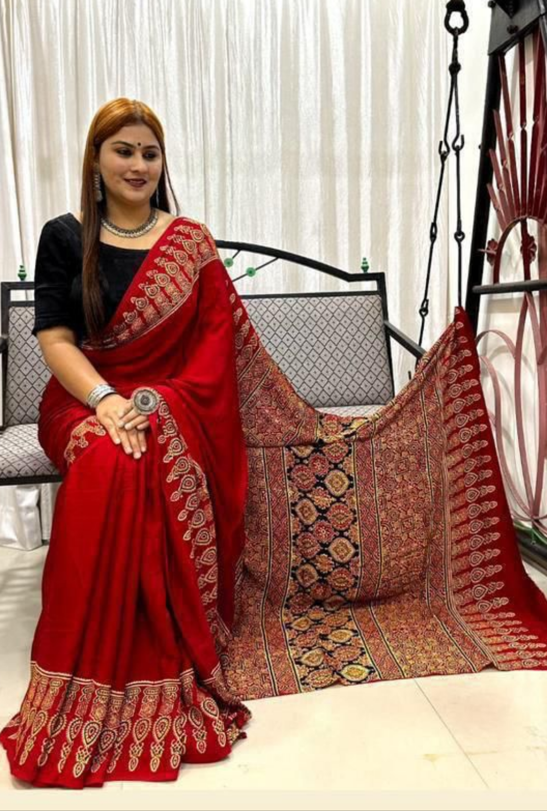 Elevate your wardrobe with the Akruti Modal Silk Ajrakh Natural Printed Saree. Crafted from luxurious modal silk, this saree features exquisite Ajrakh natural prints that blend traditional artistry with contemporary style. Its lightweight fabric ensures effortless draping, allowing you to achieve a polished look quickly and comfortably. Perfect for those who appreciate expert craftsmanship and modern elegance in one graceful ensemble.